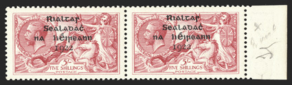 1121 nh 37 var. Image#37 var., 1922 5/- Seahorse, with Thom overprint in dull blue black and not the shiny blue black that is listed, horizontal right margin pair, excellent centering and exceedingly fresh, o.g., n.h., extremely fine; 1970 and 1995 BPA certificate noting at one time this was a separate listing of S.G. #45a (S.G. #45 var.; as normal hinged £500+). (Image) $1,150.00+