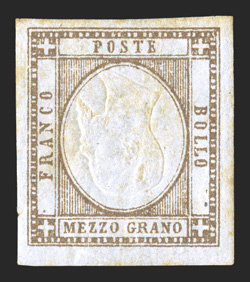 1128 og 20c Image#20c, 1861 ½g Bister, Head Inverted, handsome mint example of this scarce stamp, featuring four large to huge margins, rich color and strong embossing, full o.g., just the faintest trace of minor gum toning, otherwise extremely fine; signed A. Diena (among others) and accompanied by his clear 1968 certificate, as well as a 2009 PF certificate; ex-Cunliffe (Sassone #18f; €2,750). (Image) $1,800.00