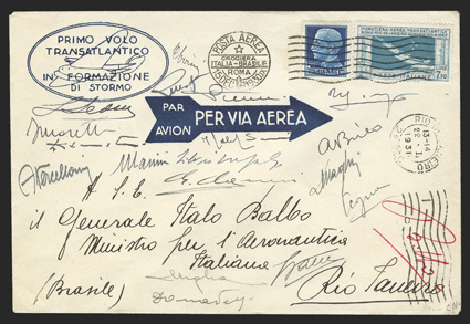 1129 c C27 Image#C27, 1930 7.70L Trans-Atlantic Squadron, tied along with 1.25L Blue by Dec. 15, 1930 flight cancel (AAMC #1125) on large flown cover to Rio de Janeiro, signed by Balbo and the other fifteen pilots, fresh and very fine. (Image) Est. $500-750