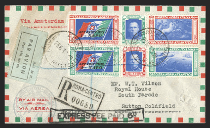 1130 c C48-49 Image#C48-49, 1933 5.25L + 19.75L and 5.25L + 44.75L Balbo air post triptychs both with "Apparecchio/I - Napo" overprints on the left stamps, tied by Rome 26.6.33 postmarks to registered Rome-Amsterdam flight cover addressed to England, appropriate Balbo Squadron flight cachet at lower left, "Via Amsterdam" directive, Rome, Amsterdam (1 July) and Sutton Coldfield backstamps as well boxed "Express Fee Paid 6d" handstamp applied on arrival in the U.K., cover with puncture at bottom right corner, otherwise very fine and attractive (Sassone #GP27; €4,250). (Image) Est. $1,500-2,000