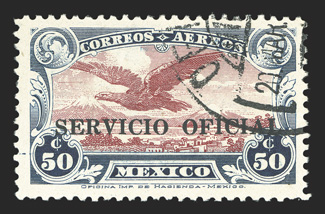 1138 O CO18 Image#CO18, 1932 50c Dark blue and claret air post official, used, with neat c.d.s cancel, deep rich colors, very fine; only 100 were printed; signed Ruidiaz, H. Bloch, as well as accompanied by a 1960 Friedl certificate. (Image) $1,000.00