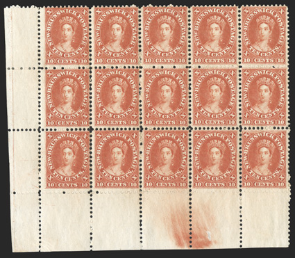 1142 nhbl 9 Image#9, 1860 10c Vermilion, bottom left corner margin block of fifteen, deep intense color, o.g., all stamps n.h., minor hinge reinforcement in selvage only, margin scuff at bottom below the fourth stamp, fine (Unitrade C$750.00+). (Image) $1,350.00+
