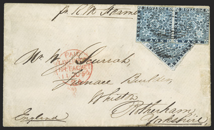 1160 c 2a Image#2a, 1851 3p Bright blue, half used as 1½p, cancelled by oval grids along with pair of 3p (#2) to make up the 7½p rate on 1859 cover to Rotherham, England (receiving backstamp), pair with faint crease between stamps, cover with some mild wear, very fine and rare; 2009 PF certificate (Unitrade C$5,000.00). (Image) $3,750.00