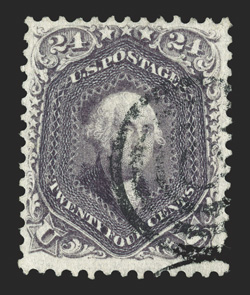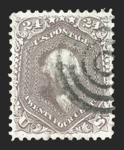 104 O 70c Image#70c, 24c Violet on thin paper, well centered and margined, wonderfully rich color and a sharp early impression, light target cancel, trivial corner perf. crease, otherwise a very fine example of this scarce stamp. (Image) $2,200.00