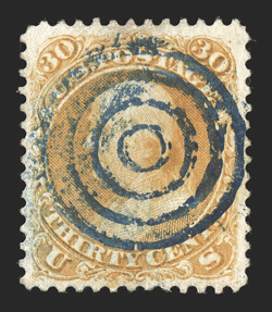 106 O 71 Image#71, 30c Orange, exceedingly well centered within large margins, cancelled by a perfectly struck blue target, extremely fine; 2003 and 2008 PF certificates. (Image) $215.00