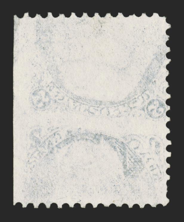 114 O 73f Image#73f, 2c Black, printed on both sides, Inverted Impression on back, a wonderfully choice used example of this extremely rare and popular variety, one of only six examples recorded to date (five used and one unused, the latter with clipped perforations on two sides), of the six recorded some have the image on the reverse right side up and some are inverted, as found on this stamp, the front of the stamp is exceptionally well centered and has a strong impression, neatly cancelled with a San Francisco double ring c.d.s., the reverse shows parts of two stamps, split almost equally, natural s.e. at right and just the trace of an inconsequential paper bend at bottom, nevertheless this is one of the finest examples recorded; an absolute "must" for the serious Two Cent "Black Jack" collector or exhibitor; clear 1974 and 2009 PF certificates; ex-Russo, Cunliffe. (imagea) (Image) $18,500.00