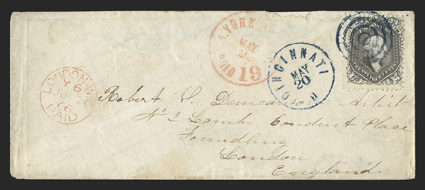 120 c 78c Image#78c, 24c Blackish violet, single centered a bit to upper right, with characteristic intense color and crisp impression, short sealed tear at lower left not noted on the certificate, tied by blue target cancel to 1866 cover to England, matching "Cincinnati, O/May 20" datestamp alongside, red New York exchange office postmark and red London receiver, very fine; an extremely rare usage of the sought-after 24c Blackish violet shade; clear 1980 PF certificate. (Image) $22,500.00