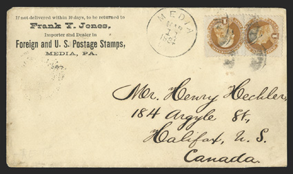 144 c 133 Image#133, 1c Buff re-issue, two nicely centered singles affixed slightly overlapping and tied to stamp dealer's corner card cover to Halifax, Canada, "Media, Pa/Mar 11, 1884" datestamp alongside, Philadelphia transit and Halifax arrival backstamps and ms. "Enclosed $1.00" notation on reverse, very fine and scarce re-issue usage; 2010 PF certificate. (Image) Est. $1,500-2,000