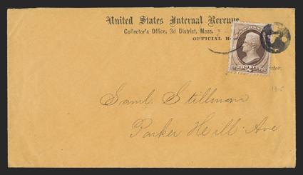 146 c 146 Image#146, 2c Red brown, nicely centered, tied by beautifully struck Jack-O-Lantern fancy cancel of Boston, Mass to buff drop cover with "United States Internal Revenue/Official Business" imprint, very fine and attractive, 2011 PF certificate. (Image) Est. $200-300