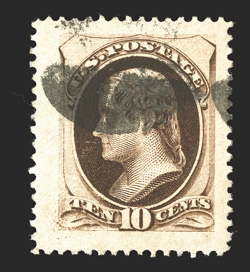 160 O 188 Image#188, 10c Brown, with secret mark, a phenomenal used example, boasting the most gigantic margins imaginable and being extraordinarily well centered within these incredible borders, strong color, cork cancel, extremely fine; an eye-popping gem; 2010 PF certificate. (Image) $32.00