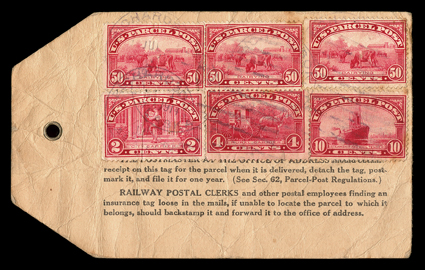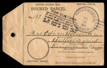 243 c Q2/10 Image#Q2, 4, 6, 10, 2c-50c Parcel post, three 50c and one each of the other values tied by Richardson, Alaska, July 16, 1914 postmarks on insured parcel tag to Kings Co., New Brunswick, tag with light creasing as expected, a few trivial toned spots, fine; a most unusual usage of the parcel post stamps. (imagea) (Image) Est. $150-200