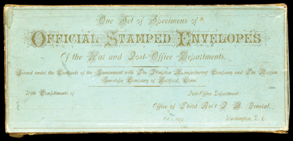 248 cS   ImageEntire "Specimen" overprint group of 48 items comprised of fifteen Columbian issue entires to 10c in various sizes, 21 2c-6c Black on lemon Official entires with various overprints, including some with "Registered Business," "Money Order Business" and "Notice to Publisher" imprints, plus twelve more Lemon entires without an indicia, some also with the imprints and twelve other official entires with values to 12c, variety of sizes and all with the overprint away from the indicia, some mostly Columbians with toning, majority fresh and very fine; also includes and original Post Office Dept. box that contained "One Set of Specimens of Official Stamped Envelopes Of the War and Post-Office Departments" dated Oct. 1, 1879 (Image) Est. $400-500