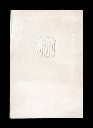 249 E   ImageEmbossed shield essay on glazed paper, die sunk on 45x68mm card, strong detailed embossing, very fine; a scarce and unlisted essay; ex-Cunliffe. (Image) Est. $100-150