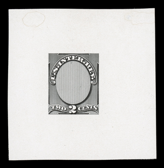 250 E Turner Essay 3a ImageTurner Essay 3a, 2c U.S. Inter. Rev., incomplete die essay, black on heavy white glossy paper, 58x60mm, showing die sinkage and a faint trace of an albino impression of the 5c design (this die was originally a combination of two designs), tiny thin speck, still very fine; ex-Cunliffe. (Image) Est. $150-200