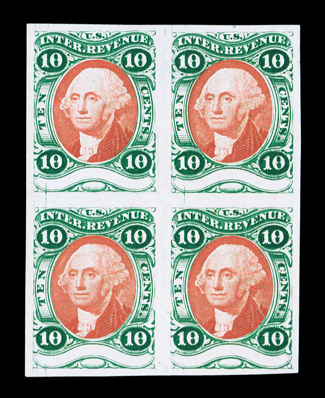 252 Ebl Turner Essay 59A-B ImageTurner Essay 59A-B, 10c U.S.I.R., plate essays on wove paper, all of the six listed colors including the green and purple on buff, in blocks of four, bright and fresh, large margins all around, two blocks with a light hinge thin, otherwise very fine and attractive; quite scarce in blocks; ex-Cunliffe. (Image) Est. $400-500