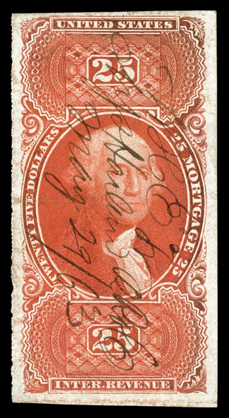 254 O R100a Image#R100a, $25.00 Mortgage, imperforate, large to extra-large margins all around, strong rich color, neat 1863 ms. cancel, light paper wrinkling, otherwise very fine. (Image) $1,600.00