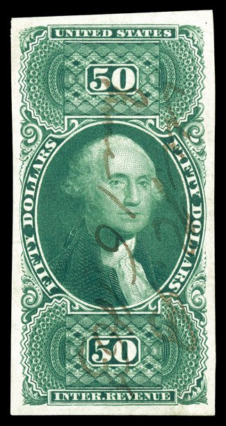 255 O R101a Image#R101a, $50.00 Green, imperforate, four exceptionally large and well balanced margins, rich luxuriant color and a well incised impression, light 1863 ms. cancel, extremely fine and choice. (Image) $250.00