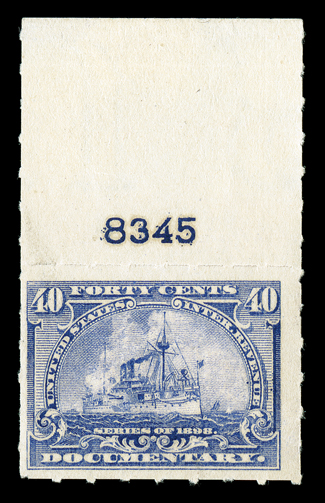 257 O R128 Image#R128, $10.00 Blue and black, a highly desirable used example, being remarkably well centered within uncharacteristically large margins, rich bright colors, light ms. cancel, extremely fine and choice. (Image) $210.00