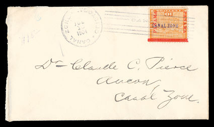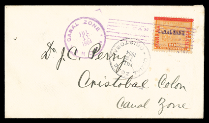 281 c 3a Image#3a, 10c Yellow, inverted "Canal Zone" overprint, single tied by Cristobal July 10, 1904 postmark on cover to Ancon (backstamp), fresh and fine; an especially elusive error on cover; 2010 PSAG certificate. (Image) $800.00