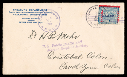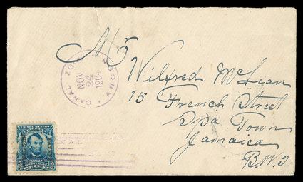 284 c 6 Image#6, 5c Blue, tied by magenta Ancon Nov 24, 1904 postmark on cover to Jamaica, Colon transit, Spanish Town and Kingston receiver backstamps, cover with tear at top not affecting adhesives or markings, fine; ex-Salz (CZSG #6). (Image) Est. $300-400
