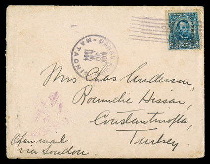 283 c 6 Image#6, 5c Blue, single with natural straight edge and guide line at left tied by Matachin November 30, 1904 postmark on cover to Constantinople, Turkey, with ms. "Open mail via Soudan", New York transit and British Post Office in Constantinople receiving backstamp, tear in backflap, fine; a particularly scarce destination; ex-Salz (CZSG #6). (Image) Est. $400-500