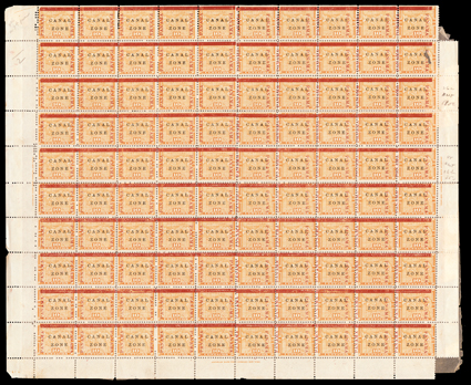 285 og 13 Image#13, 10c Yellow, complete sheet of 100, includes the Antique "Canal" at position 26 and Antique "Zone" at position 48, plus several other minor varieties, glassine interleaving stuck to gum, some selvage faults, position 20 defective, fine appearance; a rarely seen sheet. (Image) $2,433.00+