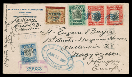 286 c 20 Image#20, 8c on 50c Bister brown, along with 1c, 2c (pair) and 5c 1906 Issue (#22-24) all tied by blue target cancels with matching Ancon Station A Jun 11, 1907 oval registry postmark on cover to Hungary, Cristobal handstamped registry marking also ties the 5c stamp, on the reverse are Cristobal transit pmk., New York registered and foreign mail oval handstamps, as well as a New York registry label, and a Hungary receiver of July 3, overall a very fine and colorful cover to a scarce destination; ex-Salz. (Image) Est. $400-500