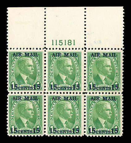 289 nhPB C2 Image#C2, 15c on 1c Yellow green, Ty. II surcharge, full top margin plate no. 115181 block of six, exceptionally fresh, o.g., n.h. except for a tiny thin speck between perforations at right, fine-very fine; a scarce plate block. (Image) $900.00