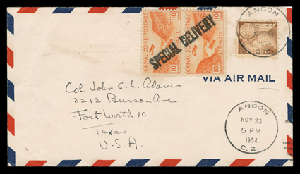 290 c C9 var. Image#C9 var., 10c Orange, with "Special Delivery" handstamp, vertical pair with the handstamp across the two stamps, on cover with 6c Light brown (#C22) tied by Ancon Nov 30, 1954 c.d.s., sent to Texas (Fort Worth receiver), very fine; when the United States withdrew its special delivery stamps in 1954, the Ancon postmaster handstamped pairs of the 10c Air post stamps "Special Delivery" (the special delivery fee was 20c), only a tiny number of covers still exist with this unusual usage; ex-Salz. (Image) Est. $150-200