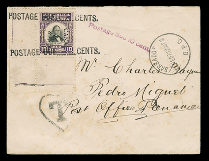 291 c 26 Image#26, 10c Violet and black, used as postage due, bottom left corner margin single tied to 1907 cover originating in Barbados by "POSTAGE DUE....CENTS" handstamps, violet "Postage due 10 cent." straight line and "T", Barbados G.P.O. c.d.s., Cristobal (Feb 18) and Pedro Miguel (Feb 19 and Apr 8) backstamps, some mild toning, fine and scarce; ex-Salz. (Image) Est. $1,000-1,500