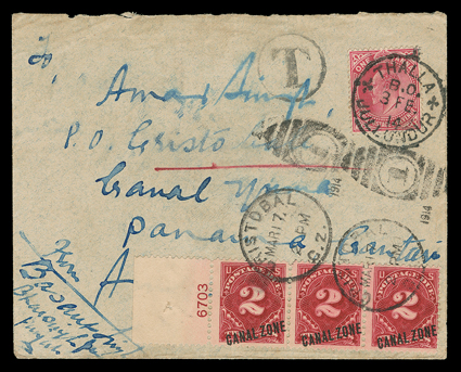 292 c J2 Image#J2, 2c Rose carmine, left margin plate no. 6703 horizontal strip of three tied by Mar 17 Cristobal duplex postmarks on 1914 cover originating in India, with 1a (#79) tied by Thalla 3 Fe. 14 c.d.s., "T" in circle, Cristobal backstamp of March 12, backflap missing, fine; ex-Salz. (Image) Est. $300-400