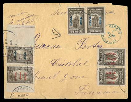 293 c J4/8 Image#J4, J5, J7, J8, 1c, 2c, 1c on 1c, 2c on 2c Olive Brown, singles of J5 and J7, horizontal pairs of J4 and J8, tied by Cristobal Mar 10 1916 c.d.s. postmarks on cover originating in Martinique, sent unpaid with blue Carbet 1 Mars 16 c.d.s. and "T" in triangle, Cristobal backstamp of Mar 7, interestingly the cover is made from a postal money order from due to the paper shortage during WWI, a few small edge tears, fine; ex-Salz. (Image) Est. $300-400