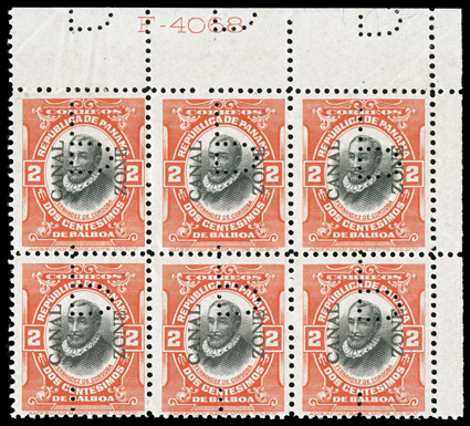 294 ogbl 39 var. Image#39 var., 2c Vermilion and black, with "P" perfin, top right corner margin block of six, with inverted "P" on all stamps and in the top margin as well, vibrant colors, o.g., natural gum bends, fine; a scarce multiple; ex-Salz (CZSG #39.PP). (Image) Est. $100-150