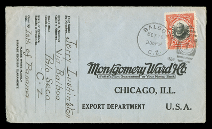 296 c 56 var. Image#56 var., 2c Orange vermilion and black, with "P" perfin, tied by Balboa Oct 10, 1924 duplex on Montgomery Ward reply cover from the Palo Soco Leper Colony, as noted on the return address, cover with some small edge flaws from used, fine; reportedly only three covers are recorded from Palo Soco; ex-Salz (CZSG #56PP). (Image) Est. $500-750