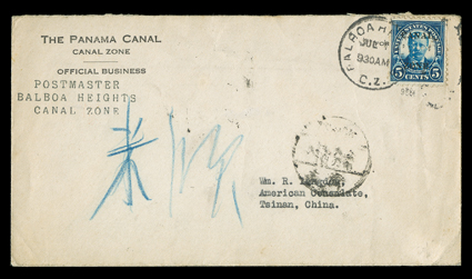 298 c 86 var. Image#86 var., 5c Dark blue, with "P" perfin, tied by Balboa Heights July ? 1926 duplex on cover to Tsinan, China, Shanghai backstamp and other Chinese markings, fine; a very scarce usage; ex-Salz (CZSG #86.PP). (Image) Est. $400-500
