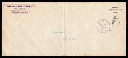 299 c   Image"German Detention Camp,/Taboga, R. de P." violet handstamp as return address on legal size penalty cover addressed to "Otto Hack, Panama, R.P", with Balboa, Jul 6, 1917 duplex, violet Panama receiver of July 6, cover with vertical file fold, fine; a scarce usage from this World War I detention camp; ex-Salz. (Image) Est. $400-500