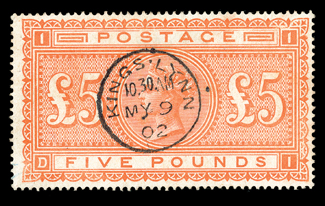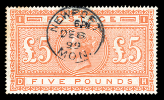 357 O 93 Image#93, 1882 £5 Bright orange on white paper, exceedingly well centered, light Newport c.d.s., very minor soiling in the left margin, otherwise very fine (S.G. #137; £4,500). (Image) $5,000.00