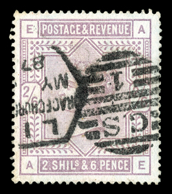 358 O 96a Image#96a, 1883 2/6 Lilac on bluish paper, used, exceptionally well centered and margined, fresh color, tiny crease at left, very fine; clear 2007 Brandon certificate (S.G. #175; £1,300). (Image) $3,250.00