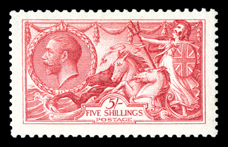 360 nh 174 Image#174, 1913 5/- Rose carmine Seahorse, Waterlow printing, "post office" fresh mint single, lovely bright color, well centered, o.g., never hinged, extremely fine; signed E. Diena and accompanied by his 1986 certificate (S.G. #401; for hinged £500). (Image) $1,050.00