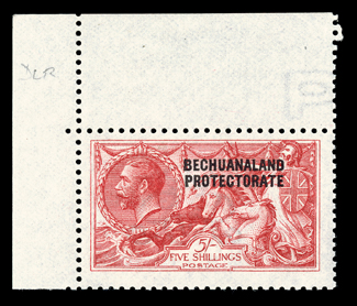 384 nh 93a Image#93a, 1919 5/- Carmine, De La Rue printing, top left corner sheet-margin single, brilliantly fresh, o.g., n.h., very fine and choice; 1996 BPA certificate (S.G. #87; for hinged £300). (Image) for hinged $350.00