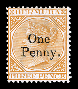 385 og 14 Image#14, 1875 "One/Penny." surcharge on 3p buff, strong fresh color, o.g., fine; signed H. Bloch and accompanied by a 1979 Brandon certificate (S.G. #16; £450). (Image) $550.00
