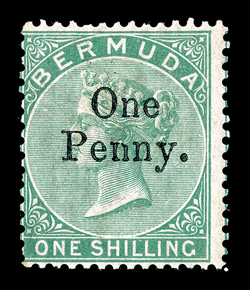 386 og 15 Image#15, 1875 "One/Penny." surcharge on 1/- Green, excellent rich color, full o.g., minor h.r., fine; 1993 Brandon certificate (S.G. #17; £500). (Image) $625.00