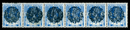 399 og S.G. #J19a ImageS.G. #J19a, 1942 6p Bright blue, experimental peacock handstamp in black, horizontal strip of six, o.g., n.h., very fine; each signed Rowell and accompanied by a 1996 Brandon certificate. (Image) £450+