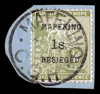 443 p 166 Image#166, 1900 1/- Mafeking surcharge on 4p Pale olive green, tied to piece by full Mafeking c.d.s., strong color, very fine (S.G. #5; £400). (Image) $425.00