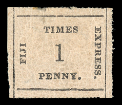 472 og 6 Image#6, 1871 1p Black on rose Fiji Times, mint example with roulettes on three sides, strong impression, full original gum, a few tiny thin specks, very fine appearance; clear 2003 Brandon certificate (S.G. #5; £1,000). (Image) $1,000.00