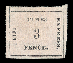473 og 7 Image#7, 1871 3p Black on pink Fiji Times, mint example with roulettes on three sides, quite fresh, full original gum, tiny h.r., very fine; a particularly scarce stamp in sound original gum condition; 1979 BPA certificate (S.G. #6; £1,700). (Image) $1,750.00