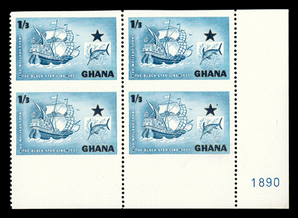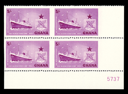 475 nhogbl S.G. #183a, 184a ImageS.G. #183a, 184a, 1957 1/3 and 5/- Viking Ship, imperforate between, the 1/3 imperforate horizontally, the 5/- imperforate vertically, both in bottom right corner margin blocks of four, containing two error pairs each, also included is the 2½p from the series (S.G. #182) in a similar block completely imperforate (not listed and uncounted in the catalog value), o.g., n.h., extremely fine (Scott #14-16 var.). (imagea) (Image) S.G. £2,400+