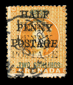 482 O 31a Image#31a, 1889 ½p on 2/- Orange and green, double surcharge, fresh color, neat c.d.s. cancel, fine; 1929 RPS certificate (S.G. #43a; £350). (Image) $375.00