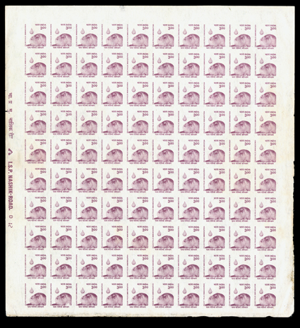 487 nh   India modern error lot consisting of S.G. #1923 imperforate pair, #1925 imperforate block of four, #1928 used imperforate strip of four, #1931 imperforate block of four, #1962 imperforate block of four, 2000 2R Rose imperforate block of four, and 2003 Govindrao Pansare block of four with misregistered gray color, most are marginal blocks, o.g., n.h., very fine-extremely fine. Est. $400-500
