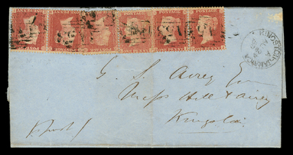 491 c SG Z97 ImageS.G. #Z97, 1857 1d Rose-red, two horizontal pairs and two singles, tied by multiple strikes of "A53" obliterator to fresh folded letter to Kingston, reverse with clear "Mandeville/Jamaica/Au 23, 1859" origin postmark and "Kingston-Jamaica/Au 24, 59" arrival datestamp on front, one single with pre-affixing creases, very fine (Scott #A93). (Image) Est. $500-750
